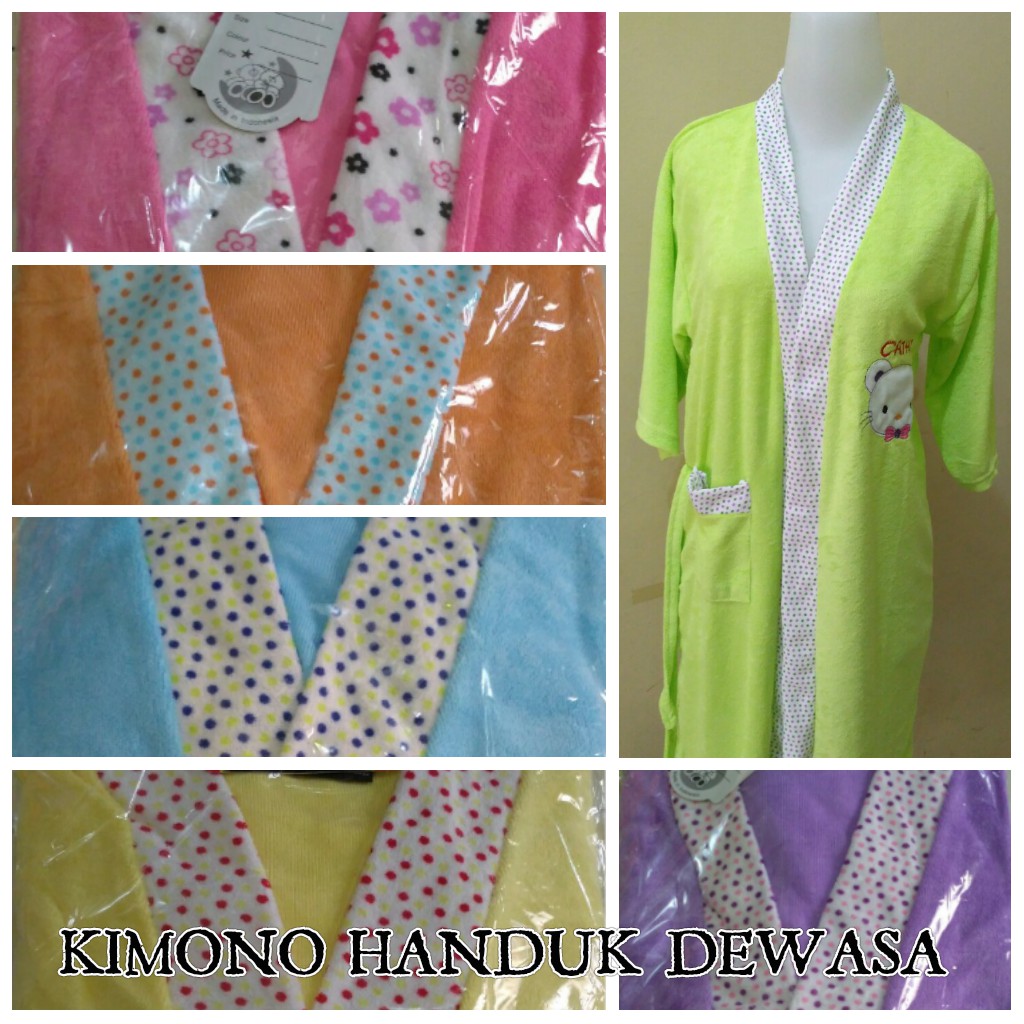Kimono handuk dewasaLD : 100 cm Panjang : 98 cmBahan : Handuk halusBerat : 300 gram ( 1 kg muat 4 pcs )Untuk motif dan warna random ( kasih catatan warna saat checkout agar kami dapat sesuaikan, apabila warna kosong kami kirim warna lain )Happy Shop