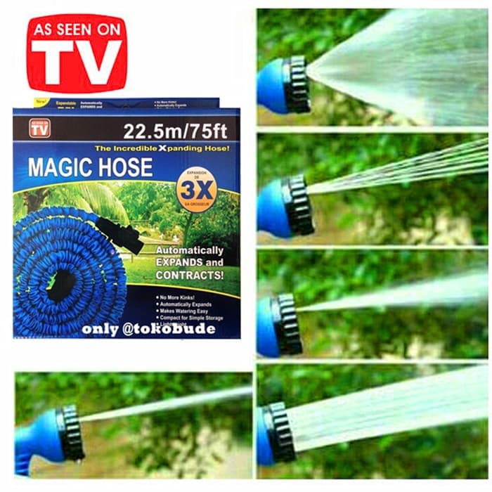 Terlaris Selang Magic Hose 22,5M Selang Air AjaibSelang Air Ajaib Magic Hose yang bisa memanjang ( expand ) dan memendek ( shrink) tergantung isi didalamnya. Selang air ajaib Magic Hose ini juga di lengkapi dengan Sprayer yang memiliki 7 pola nozzle sprayer. Konsep Magic Hose / Expandable Hose / Xhose ini sebenarnya sederhana, yaitu surgical tubing dengan diameter besar yang mengembang akibat kontraksi karena adanya tekanan hidrolik dari air.Karaketer Selang Air Ajaib Magic Garden Expand HoseMagic Hose Dapat memanjang otomatis hingga 3 kali dari ukuran normalSelang secara otomatis berkontraksi ketika air di hentikan / dimatikanSelang Magic Hose ini sangat ringan dan kuatTidak akan pernah menjadi kusutPanjang normal ( sebelum memanjang) sekitar 2.5 M bisa memanjang hingga 22.5mDiameter selang bagian dalam 6MM dan diameter luar 9MM.Konektor selang air ini adalah terdiri dari Konektor Female dan konektor male, dilengkapi 1 piece valve (tuas) mematikan yang mudah disambungkan.Nozzle Sprayer memiliki 7 fungsi semprotan berbeda yaitu : Jet, Shower, Flat, Cone, Soaker, Mist danCenterBahan selang air ajaib ini adalah high density polymer untuk bagian dalam dan polyester pada bagian luar selang.Tips Perawatan Selang ajaib Magic HoseKeringkan isinya setelah digunakanSelang air ajaib ini janga dibiarkan terlalu lama terpanggang sinar matahari, karena lambat laun mengurangi elastisitas surgical tubing.Jangan di seret di area yang banyak duri.Hati-hati dalam penyambungan konektornyaMagic Hose Dapat Anda Gunakan untukMenyiram tanaman taman andaMencuci / membersihkan / membilas mobil,Membersihkan perkarangan, rumah dan bagian lain dari rumah andaDan masih banyak keperluan lai