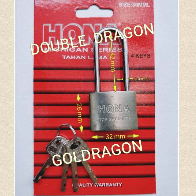 Gembok- Merk : HONA- Ukuran : 30 mm- Leher (shackle) : Panjang- Anak Kunci : 4 buah- Material : Besi (Iron)- Sistem Non Per (tanpa per), anak kunci hanya bisa dicabut dalam posisi terkunci.Dimensi Body Gembok :- Lebar : 32 mm (= 3,2 cm).- Tinggi : 26 mm (= 2,6 cm).Dimensi Leher Gembok (Shackle) :- Tinggi : 42 mm (=4,2 cm) posisi terkunci.- Diameter : 4,5 mm (= 0,45 cm).Cocok juga dipakai untuk "GEMBOK KOP