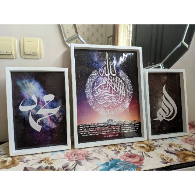 hiasan dinding kaligrafi set ayat kursi dan allah muhammad galaxy- ayat kursi uk 30x40- allah muhammad uk 20x30- bahan sudah di laminasi ant