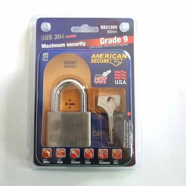 GEMBOK AMERICAN SECUREANAK KUNCI : 3 pcs-----------------------------------------------------------------PERBEDAAN DENGAN VERSI LAMA : - VERSI BARU TANPA HARDSHIELD(SILINDER SUDAH DI LAS KE BODY GEMBOK JADI LEBIH SULIT DICONGKEL, CEK FOTO)- ANAK KUNCI STAINLESS STEEL SUS 304-----------------------------------------------------------------KEUNGGULAN GEMBOK AMERICAN SECURE : - ANTI KARAT (STAINLESS 304)- ANTI POTONG- ANTI CAIRAN KIMIA (LOCKING BALL . HARDENED STEEL)- ANTI GERGAJI- ANTI BOR- ANTI KETOK- TAHAN CUACA (IP68 WEATHER P